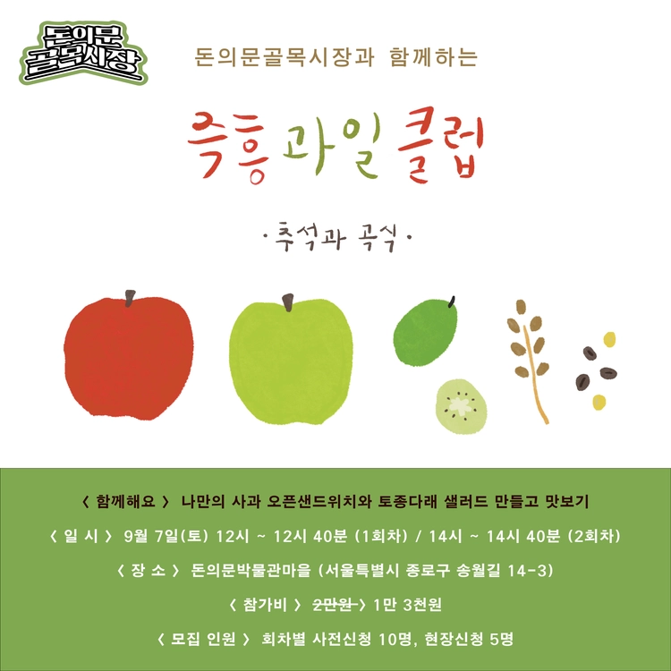돈의문골목시장과 함께하는 9월의 즉흥과일클럽에 벗님들을 초대합니다. 사과와 토종다래, 흑보리 미숫가루를 준비하려 해요. 나만의 샌드위치와 샐러드를 함께 만들어 보아요!