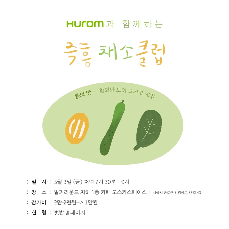 휴롬과 함께하는 5월의 즉흥채소클럽에 벗 여러분들을 초대합니다. 참외, 오이, 케일과 함께 다가오는 봄을 즐겨보아요. 🥒🥬