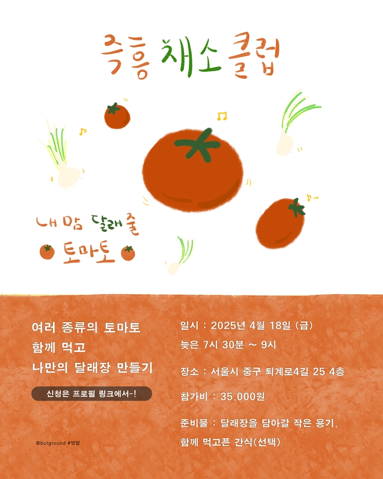 4월의 즉흥채소클럽에서는 여러 종류의 토마토와, 제철 달래를 함께 맛봅니다. 봄기운을 머금은 토마토와 달래에서는 어떤 향과 맛이 나는지 찬찬히 느낀 후, 각종 시즈닝을 활용해 나만의 달래장을 만듭니다.