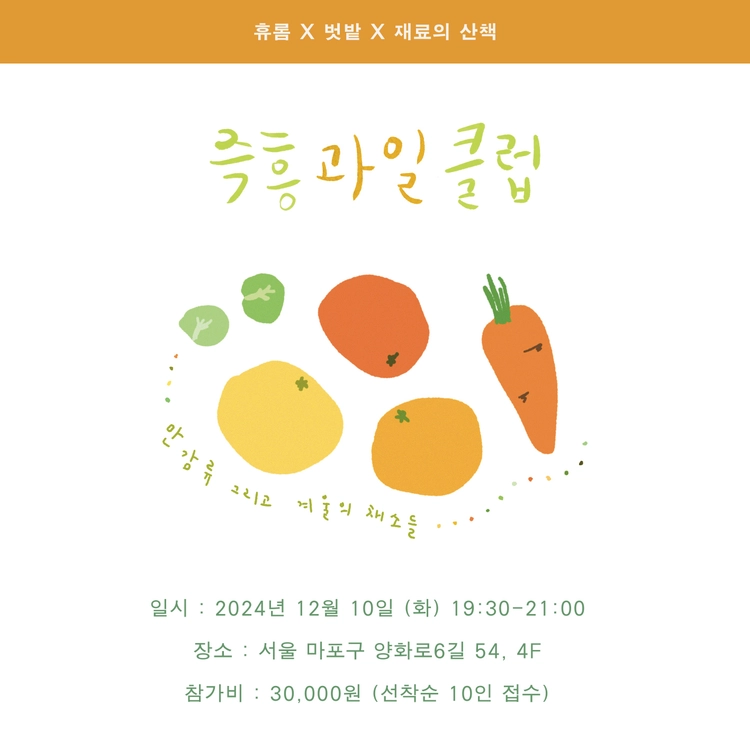 휴롬 그리고 재료의 산책과 함께하는 12월의 즉흥과일클럽. 만감류와 겨울 채소로 산뜻한 겨울 저녁을 보낼 벗님들을 모집합니다.