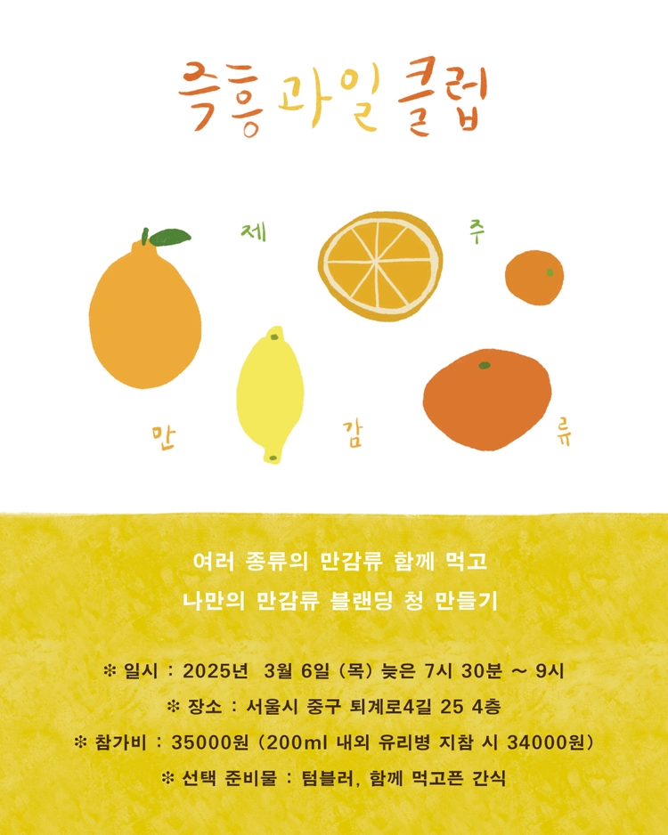 3월의 즉흥과일클럽에서는 여러 종류의 만감류를 함께 맛봅니다. 봄을 앞둔 만감류에서는 어떤 향과 맛이 나는지 찬찬히 느끼고, 껍질과 과육을 활용해 나만의 블랜딩 청을 만듭니다.