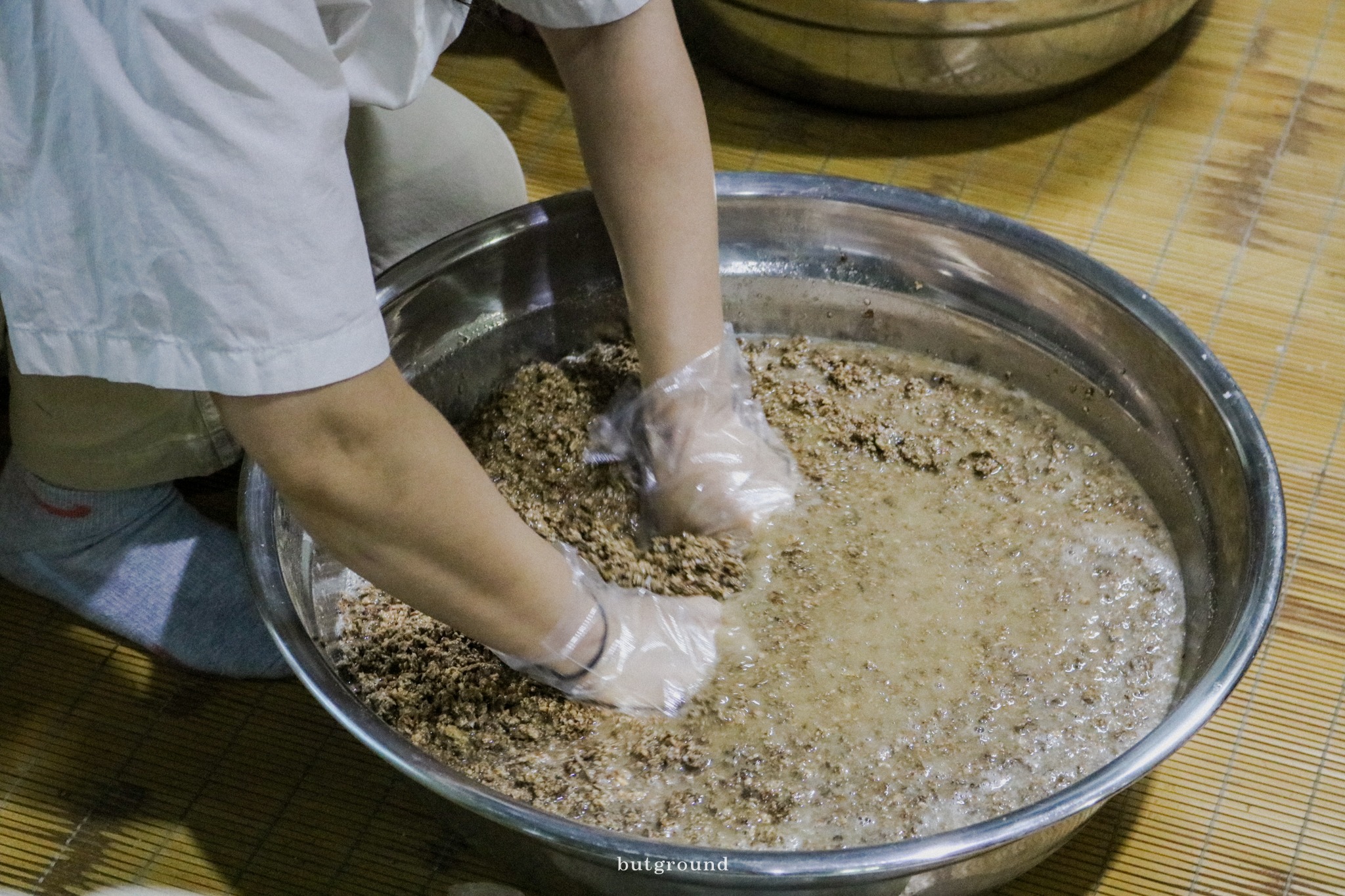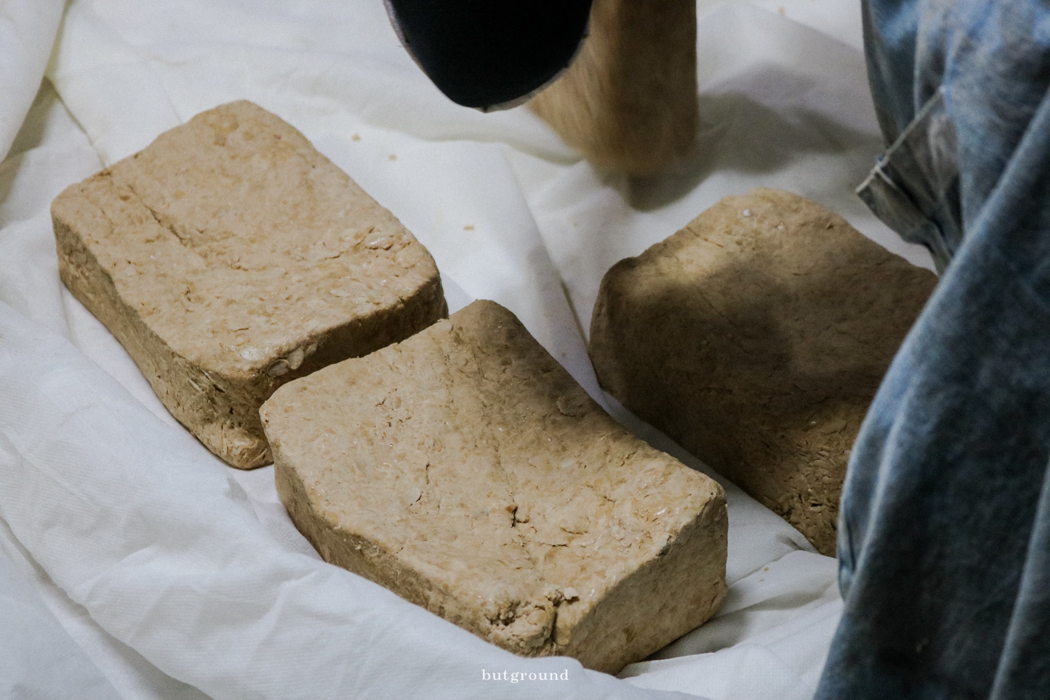 넘치게 채운 대화에, 시간이 모자라 서둘러 향한 곳은 남산마을의 구배기된장입니다. 메모장을 열어보니 띄엄띄엄 적힌 기록이 눈에 띕니다. 공기가 들어가지 않도록 발로 꾹꾹 다져서 메주를 만들어야 좋다는 말씀에, 들어가자마자 정신없이 한이님의 도움으로 메주콩을 으깨고, 눈 깜짝할 새 네 덩어리 메주를 완성했어요. 이게 이렇게 빨리 완성되는 건가, 눈이 휘둥그레졌습니다. 콩 위에 선 한이님이 넘어지지 않도록 손을 붙잡아주신 다른 벗님의 손도 너무나 다정했습니다. 혼자라면 무리지만, 함께라면 즐거움이 된다는 걸 김 나는 메주에서 배웠습니다.