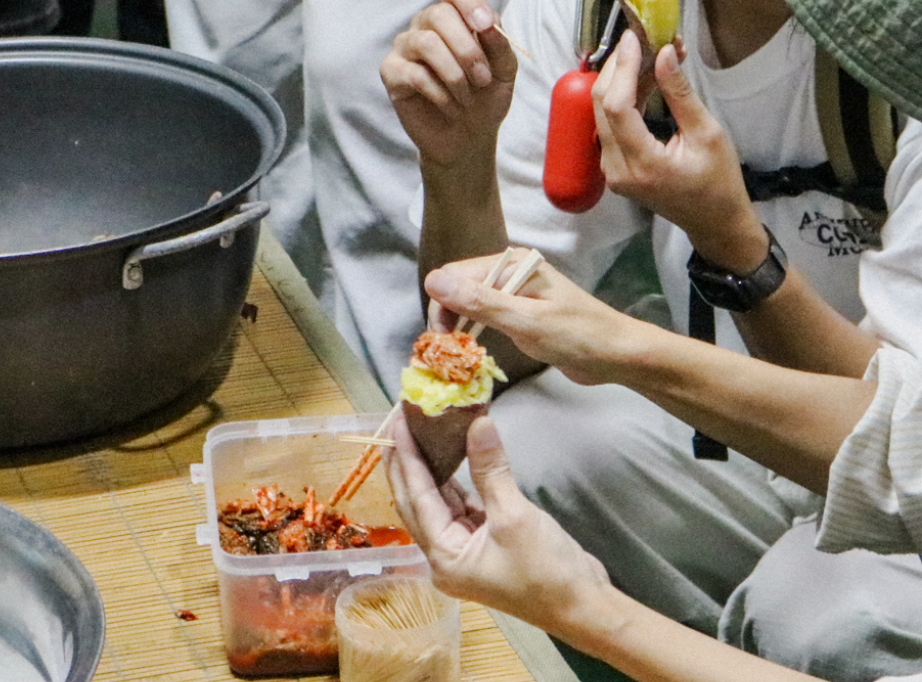 자원해주신 벗님들의 손길로 된장이 만들어지는 동안, 한켠에서는 고구마와 김치 시식이 이어졌습니다. 김치 한 조각을 입에 넣자마자 "와! 맛있다!"는 감탄이 연달아 터져나왔습니다. 김치의 핵심은 배추를 절이는 것이라는 말씀에서 요리에 대한 선생님의 신념이 어렴풋 느껴졌습니다.