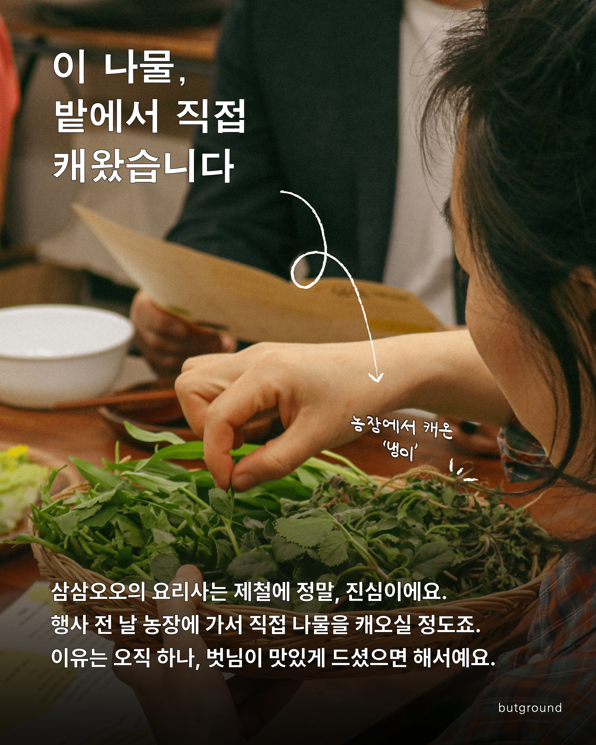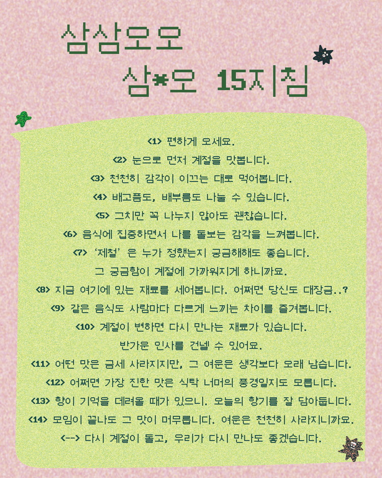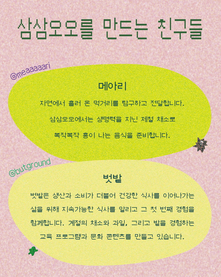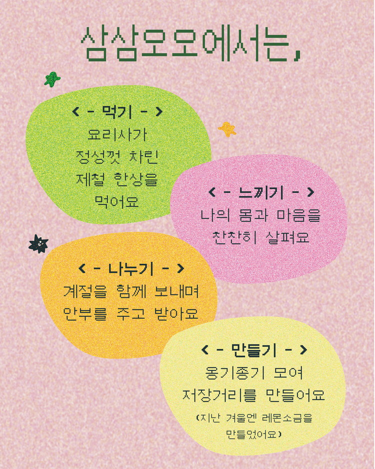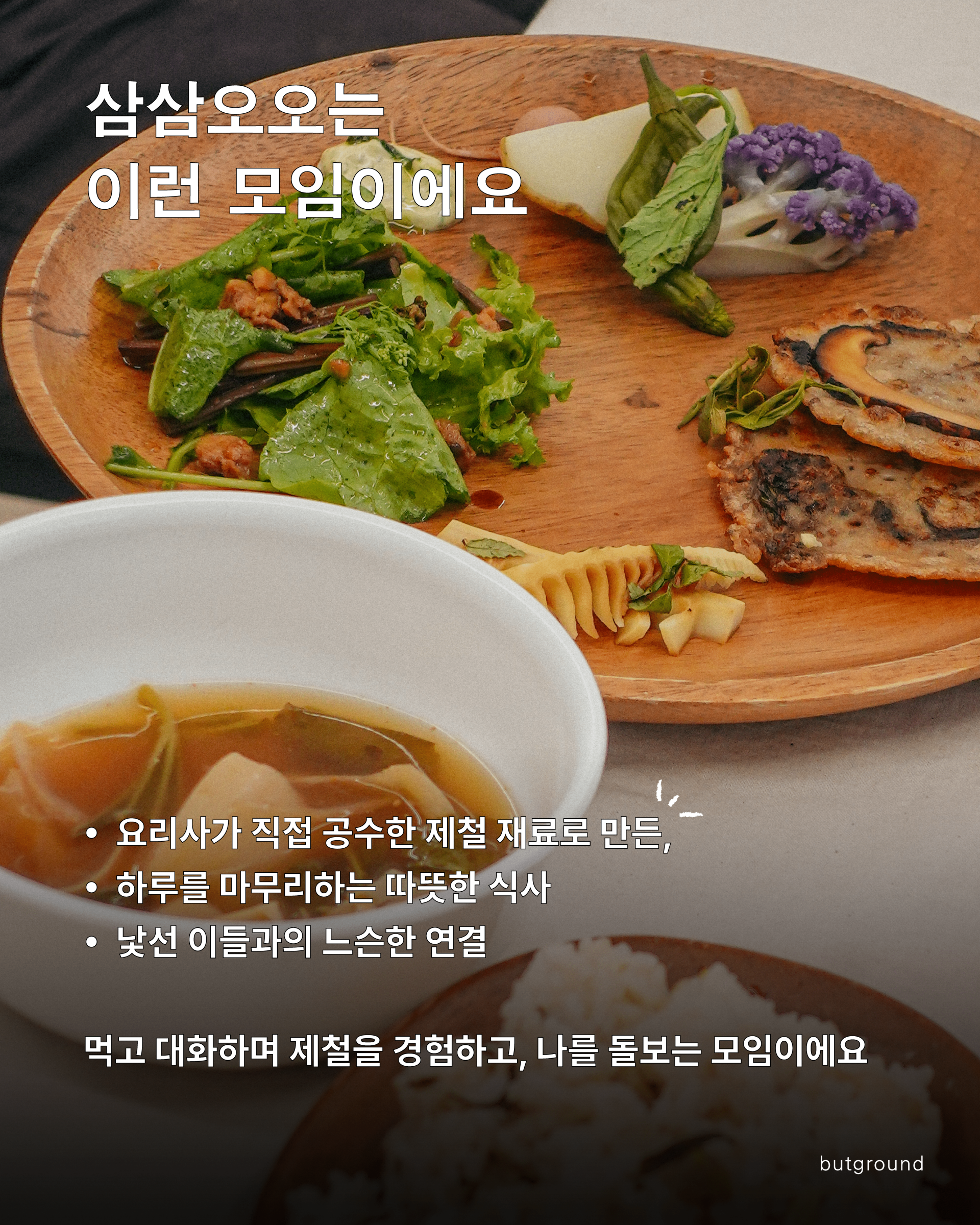 삼삼오오의 제철 식사모임에선 식사를 통해 우리를 온전히 돌보아갑니다.