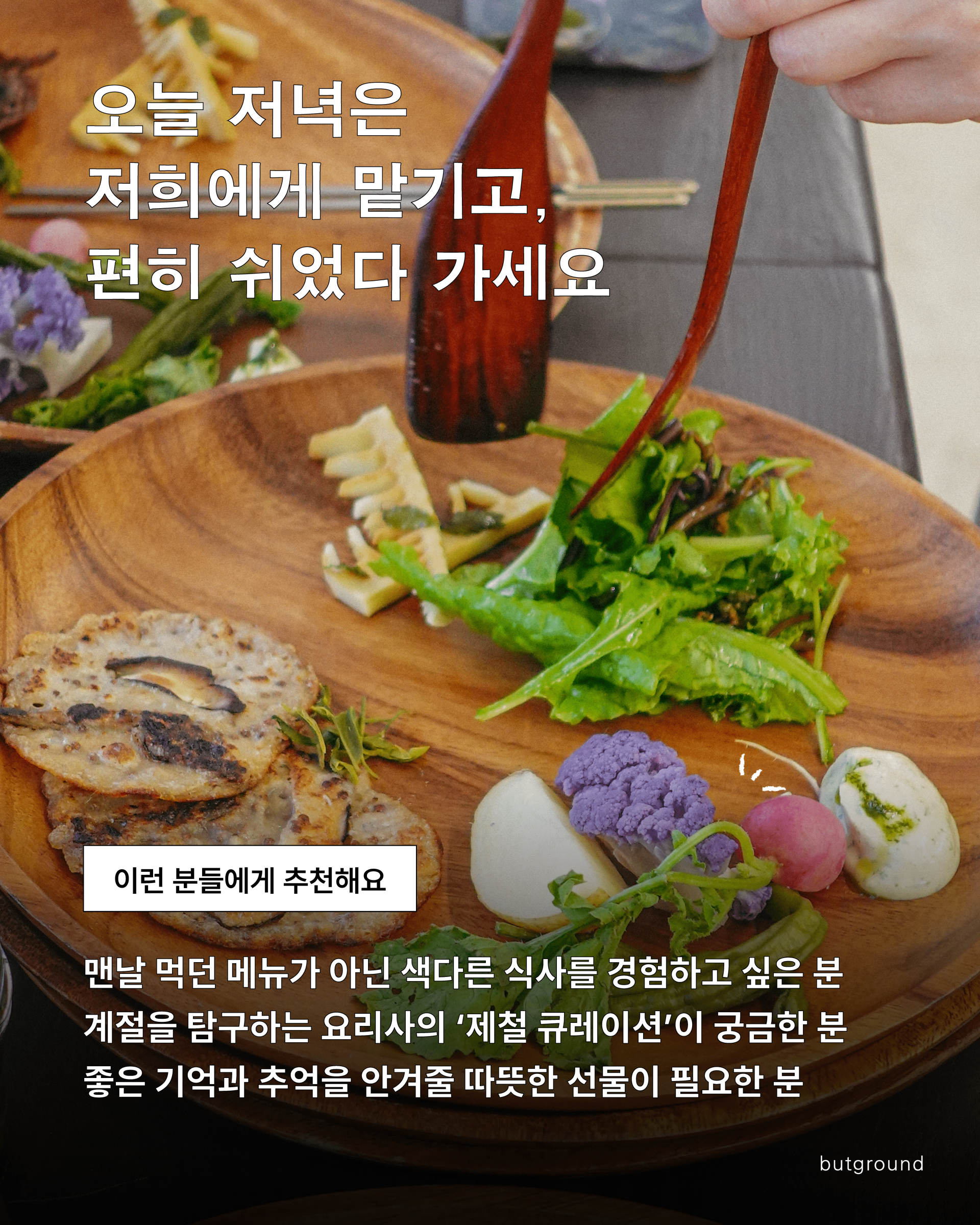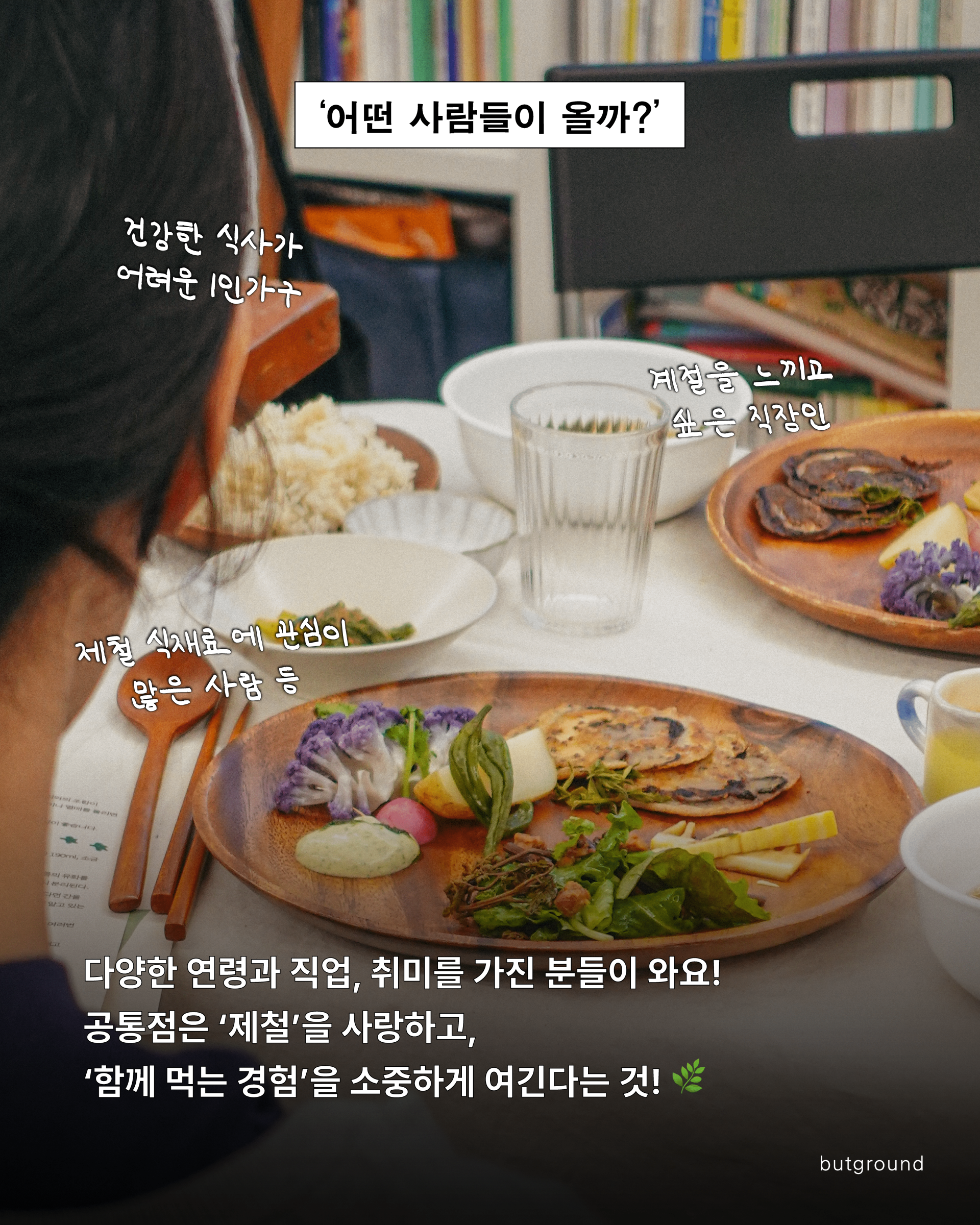 나의 감각을 기록하고, 다른 이들의 이야기에 귀 기울이며, 함께 둘러앉아 따뜻한 제철 한 끼를 나누어봅니다.