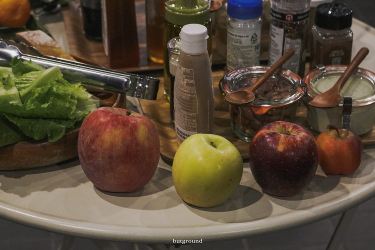 다양한 품종의 사과와 씨앗(풋콩/볶은 땅콩/밤/들깨/피칸 등), 차와 식사용 빵 등