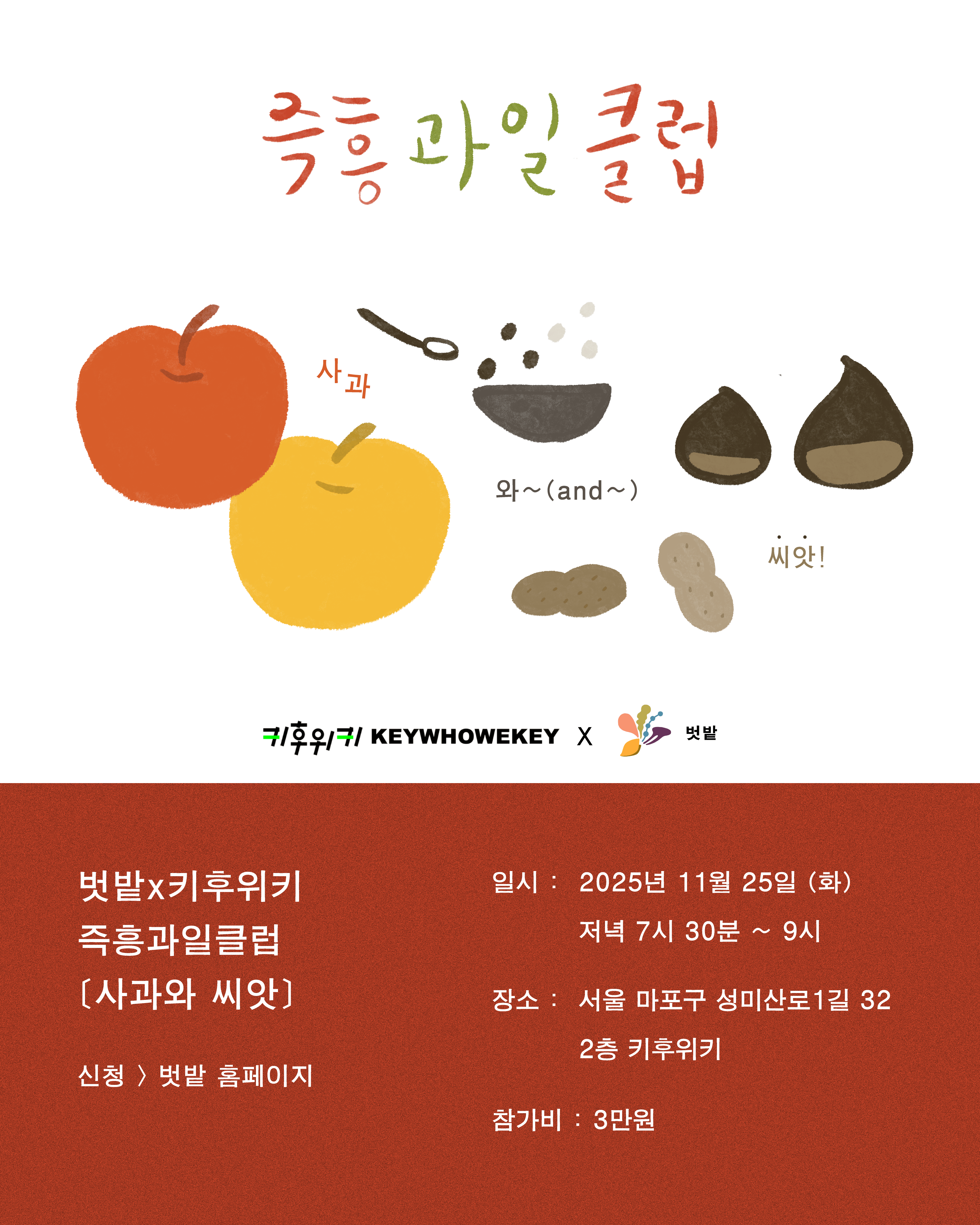 이번 즉흥과일클럽에서는 가을의 끝자락을 지키는 열매, 사과와 씨앗을 함께 맛봅니다.